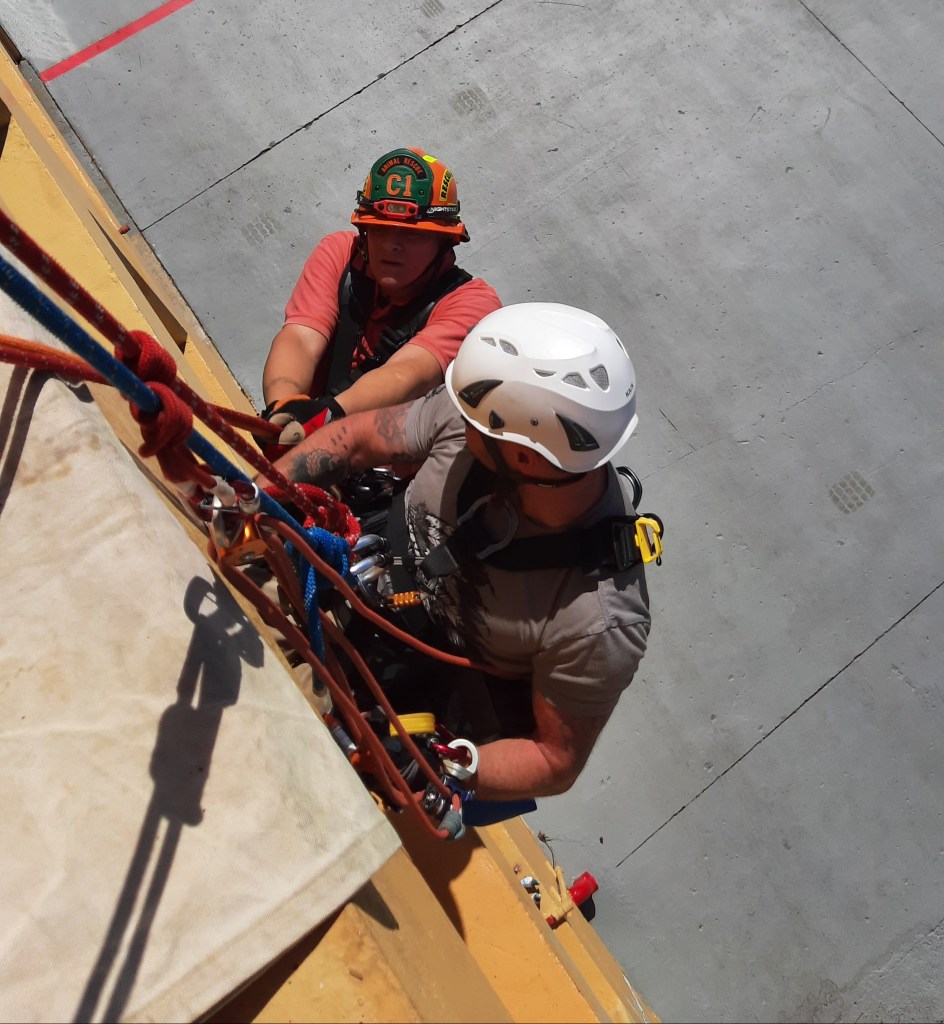 While in the classroom on day one students practiced knots, discussed mechanical advantage, the T-system, anchors, personal protective equipment, rope, webbing, edge protection, safety, and standards. We were split into two teams prior to training in the tower.