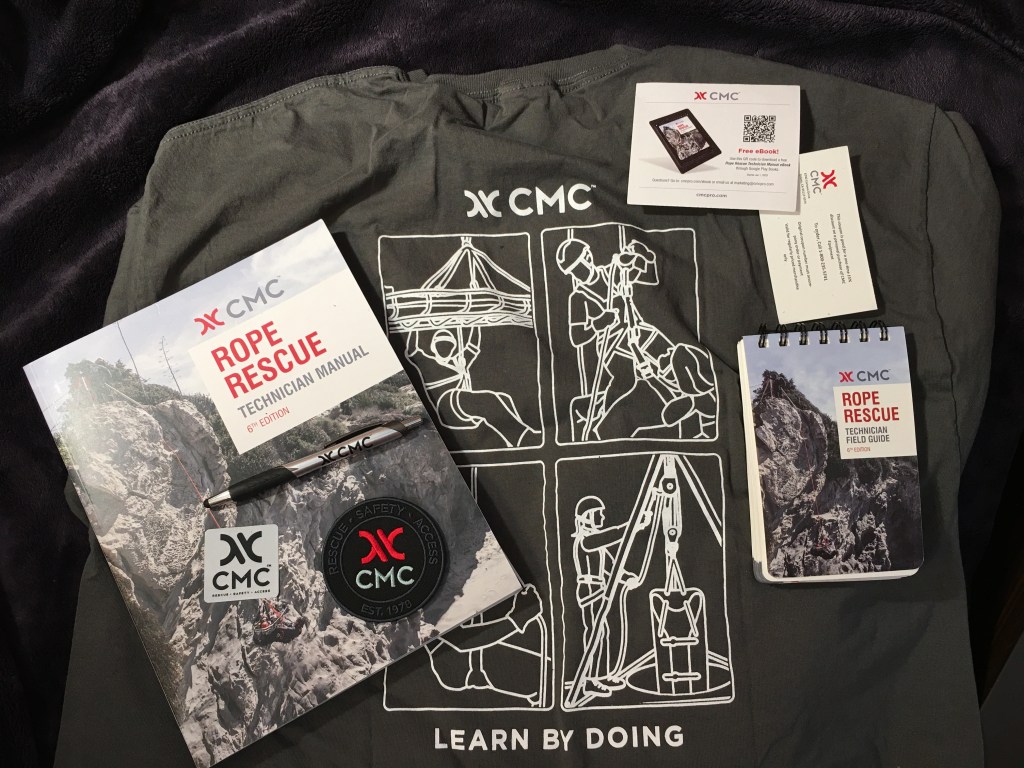 CMC swag included a cool tee shirt you can only get if you attend training, an ink pen, reflective decal and a Velcro backed patch. There was a q-code coupon for the current digital version of the Rope Rescue Technician Manual. And a one time use coupon for 15% off a purchase for personal equipment.