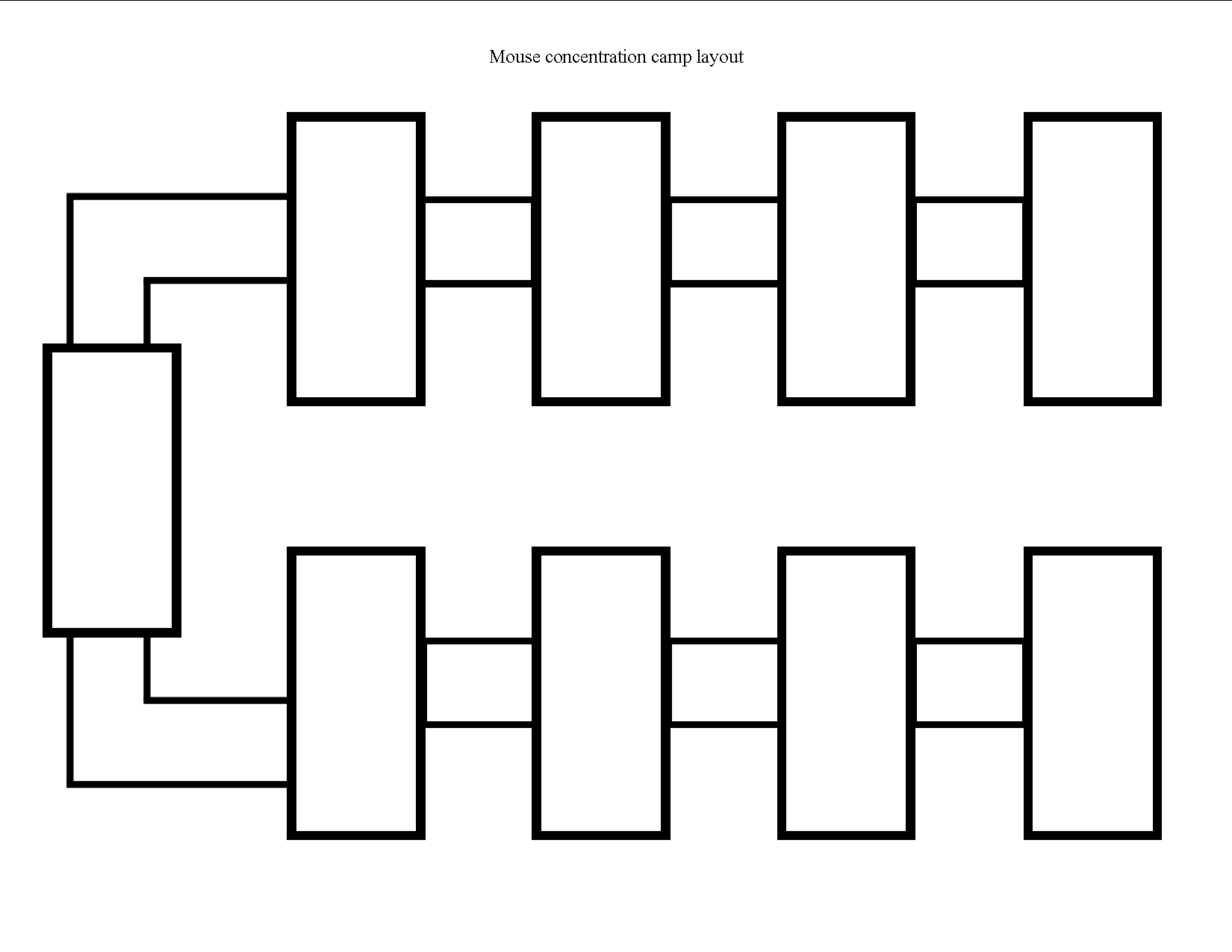 All of the cages were lined up in two rows with interconnecting tunnels with a single cage at one end. Fish bowls at the four corners. It had suddenly dawned on me how this looked like an overhead view of a concentration camp. Then I though the birds must have been the Nazi leaders, the cats the SS and the mice all of those who had been sent to the concentration camps, Siamese fighting fish the camp overseers or guards. It rose the hair on my arms to think about. I quickly gathered up the mice into a single cage then put them and the fish into the transport.