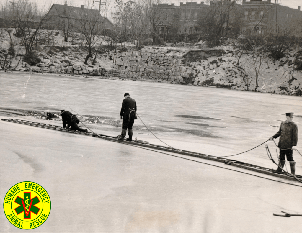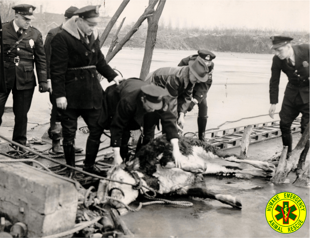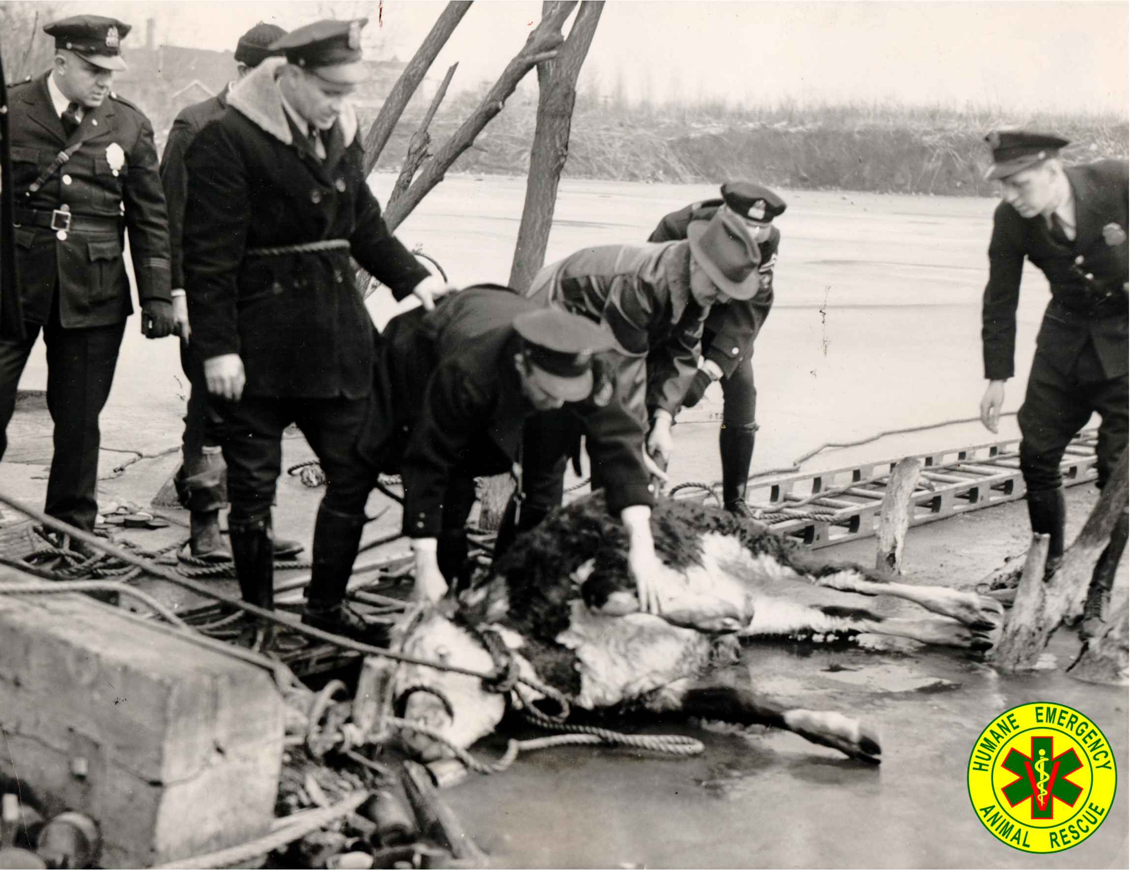 “St. Louis, MO- Ferdinand, the steer, after escaping from a truck driver, started on a tour of St. Louis, MO., until he came to an ice covered stone quarry and crashed into water 250 feet deep. He was rescued by Humane Society Officers and Firemen who used ladders laid along the ice to reach the animal. Photo 1, Humane Officer George Partney and Lt. Thomas Carton of the fire department throwing a rope around Ferdinand’s neck. Photo 2, Ferdinand safe and sound after he was pulled out of the ice water.”