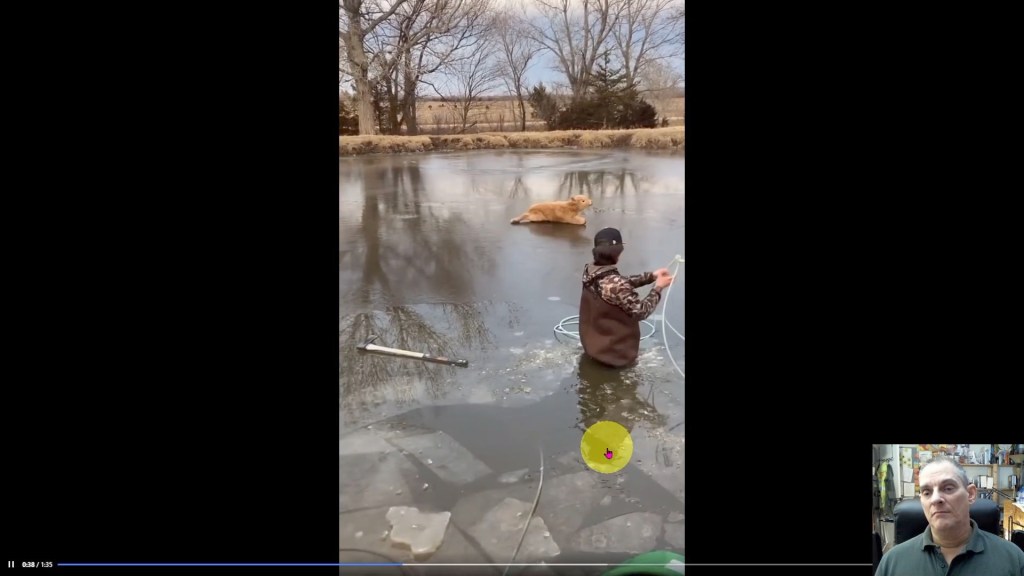 Calf stuck on frozen pond gets roped by an expert and brought to shore.