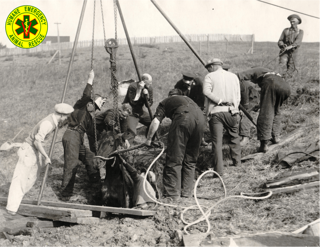 “Rex, a San Francisco horse just fell in a well, accidentally, of course, while grazing. And before he could be removed, police, firemen and the S.P.C.A. all had been called. Here’s the final effort. Five minutes later Rex was grazing again—but watching his step.”