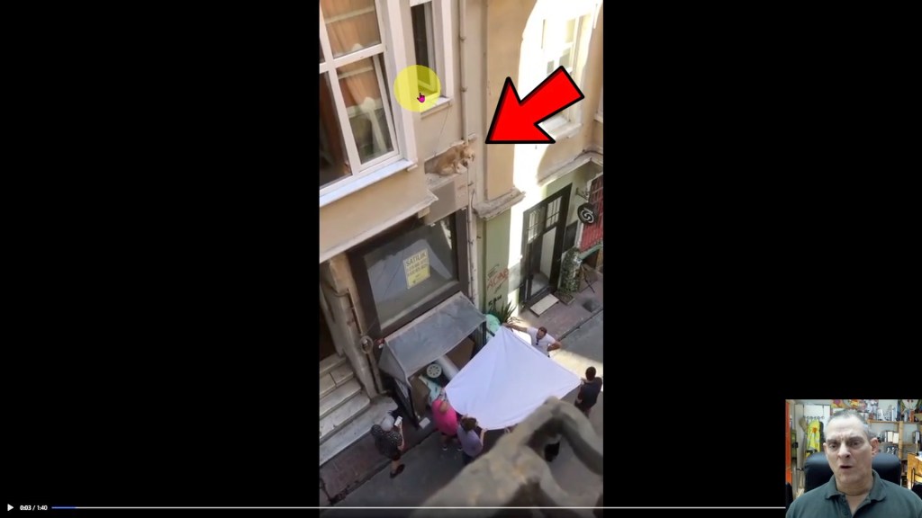 In this video a dog is stuck on a second floor air conditioner walks the plank to safety.