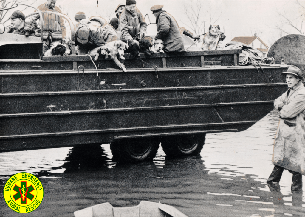 “St Paul, Minn., Rescue workers load canine refugees from the St. Paul Humane Society animal shelter aboard an army duck. The animals had to be removed to higher ground as floodwaters surrounded the shelter. The flood reached a crest of 19.1 feet here yesterday.”