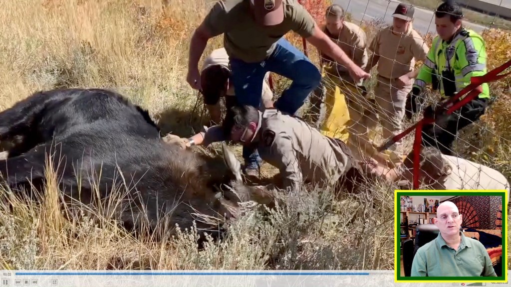 In this video a moose on the wrong side of a highway barrier gets darted then moved to a safe location.