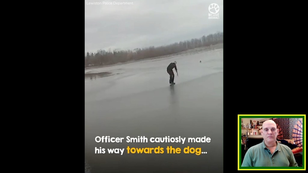 A police officer takes an unnecessary risk to rescue a dog that has fallen through the ice on a body of water. First rule, don’t run!